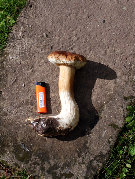 Казалось бы можно подождать, дать подрасти, самый большой около 8 см. в высоту. Но во-первых у него уже в ножке немного червей, а в шляпке маленькая полость с еще не созревшими яйцами, значит завтра его съели бы насквозь, и та же участь ждала бы более мелкие. Во-вторых это место никто еще чудом только не нашел, оно у самой тропы, ведущей за трассу, и у более взрослых грибофф шанса достаться именно мне тупо не будет.