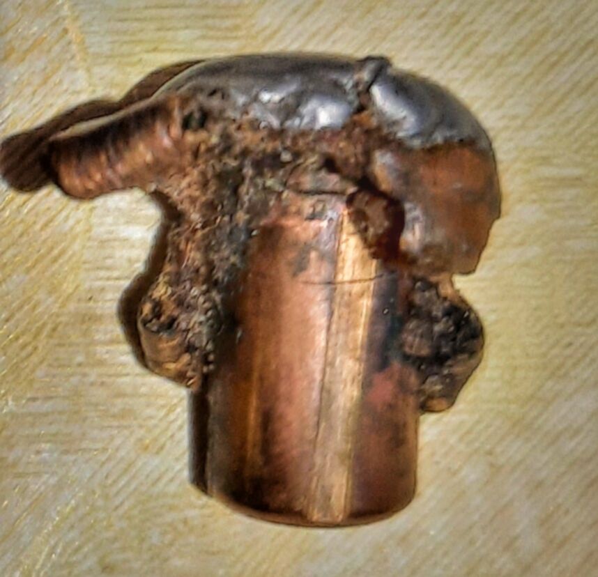 В коллекции есть пули Вулкан, Мега - отличное раскрытие, достаточно большая остаточная масса, хоть там и ни слова про "пайку". Но оно и видно по внутренней поверхности разорванной оболочки. Есть там и двухкомпонентная пуля РМР, точнее, что от неё остается: отделившаяся оболочка, нижний сердечник и немного рваной оболочки - отдельно. Работает плохо- разбивается на шкуре и разлетается на части -огромная гематома с минимальным проникновением.