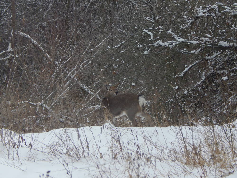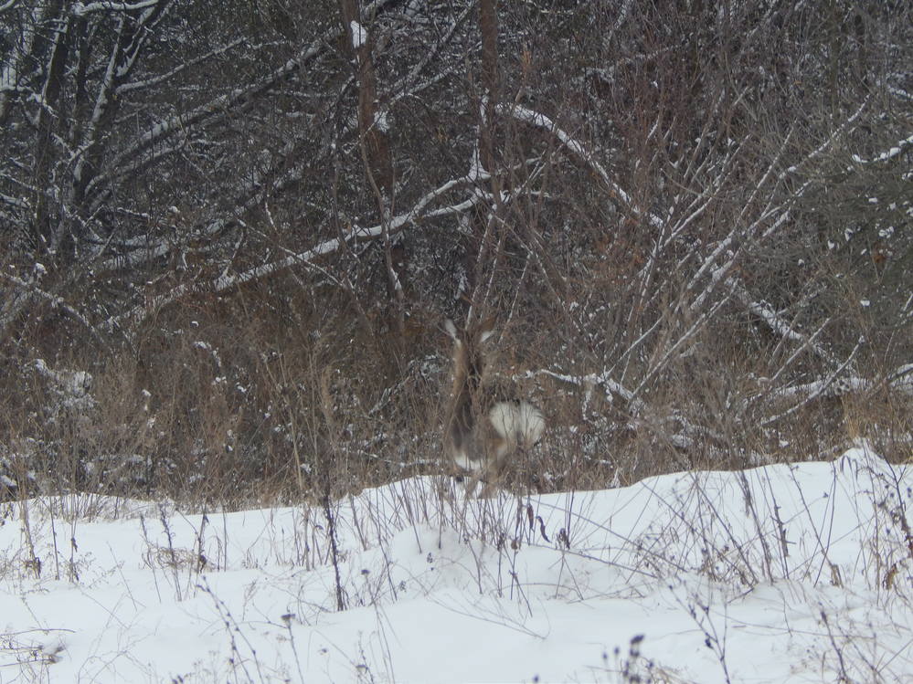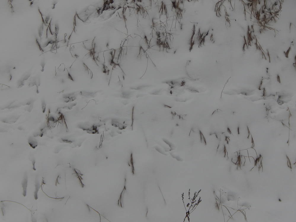 Вновь расходимся , на полянке вижу скидку в густоту терновника , начинаю обходить, слышу шорох веток и утекающего зайца, да что ж это такое ..Кусты постепенно кончились , выходим в стадо коров , они здорово осложнили и без того сложное тропление .Следы то и дело дают мне знать , что косые тут лежат, несмотря на скотину , к ней они приучены, да и охотников тут не бывает .Издалека вижу куртину выцвевшей осоки , когда то давно с другом тут упускали трофей