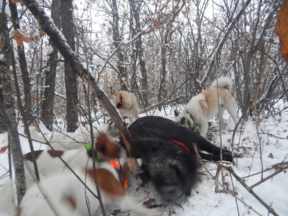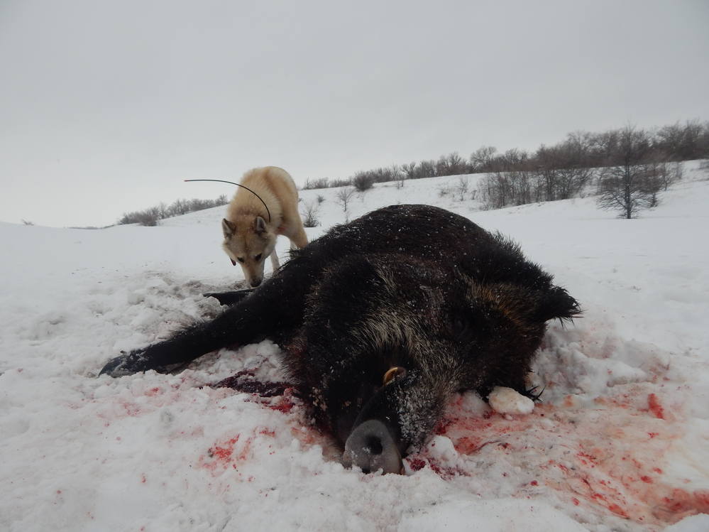 Венец охоты был секач, он лихо уходил через загонщиков не обращал внимания на собак, но каждую ночь он выходил на кукурузу , померзнуть пришлось изрядно , но как всегда по воле случая встретились мы с ним случайно по одной тропе навстречу друг другу шли - кабан лег на месте. Кстати забыл в обоих секачах нашел картечь , свинцовые болванки затянуло жиром , но раневые каналы были заполнен гноем так что куски мяса грамм по 500 пришлось выкидывать и явно при жизни они причиняли беспокойство животным. Вот ока все что хотел написать.