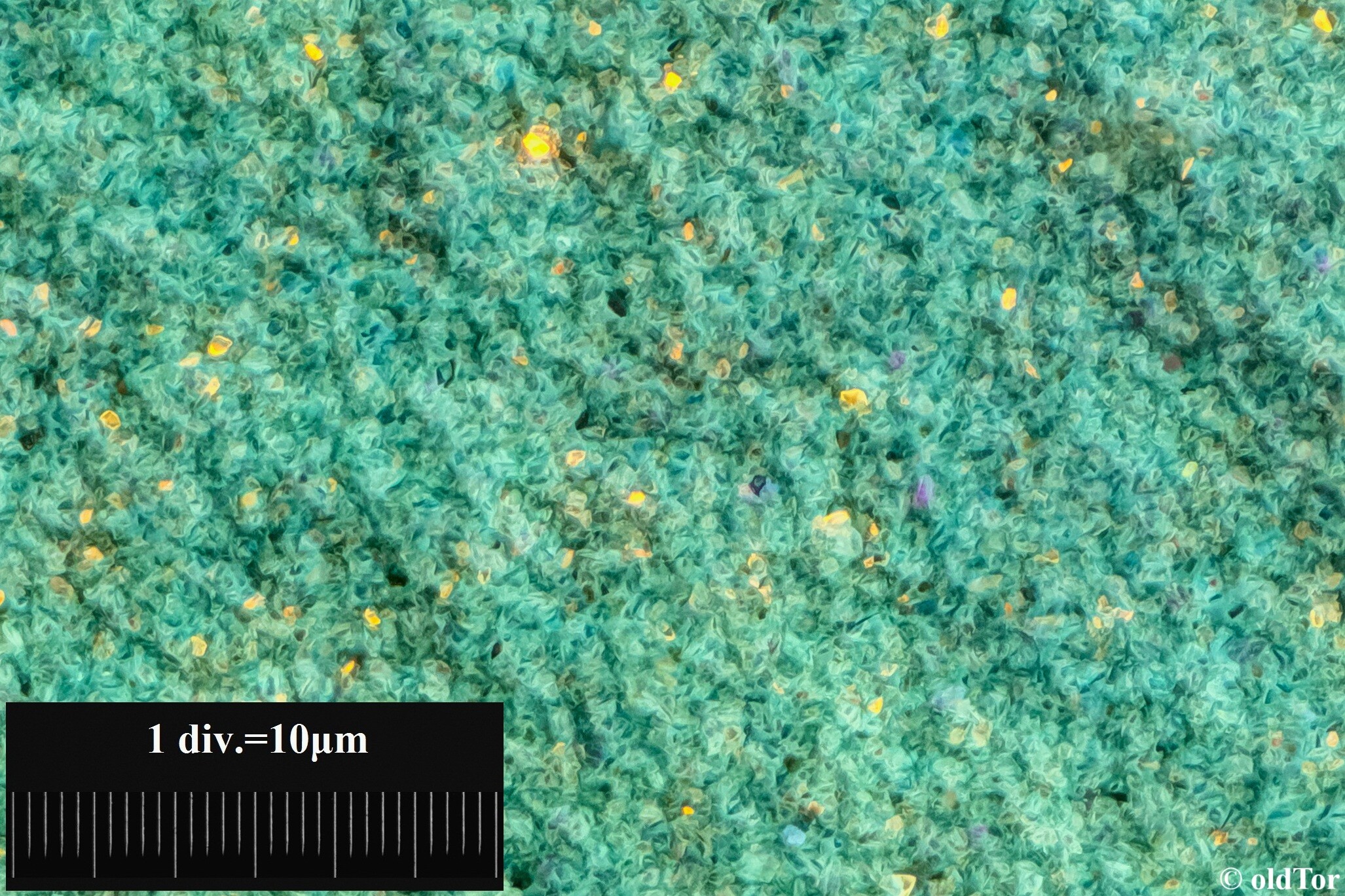 Занятная шкурка - в случае с 3М, как всегда, понятно за что платишь (по крайней мере при подобных возможностях оценки) - удивительно равномерный размер частиц, что для шкурок не такое частое явление, очень высокая концентрация абразива и при том очень плотная "упакованность" зерна в связку. Интересно выглядит: связка сама флуоресцирует, при том, просвечивающие через неё зёрна практически не светятся - их свечение под слоем связки слабовато и забивается её собственным. При том, зёрна из связки слегка выпирающие, либо не светятся совсем (чёрные, что ожидаемо), либо светятся довольно ярко жёлтым и синим.