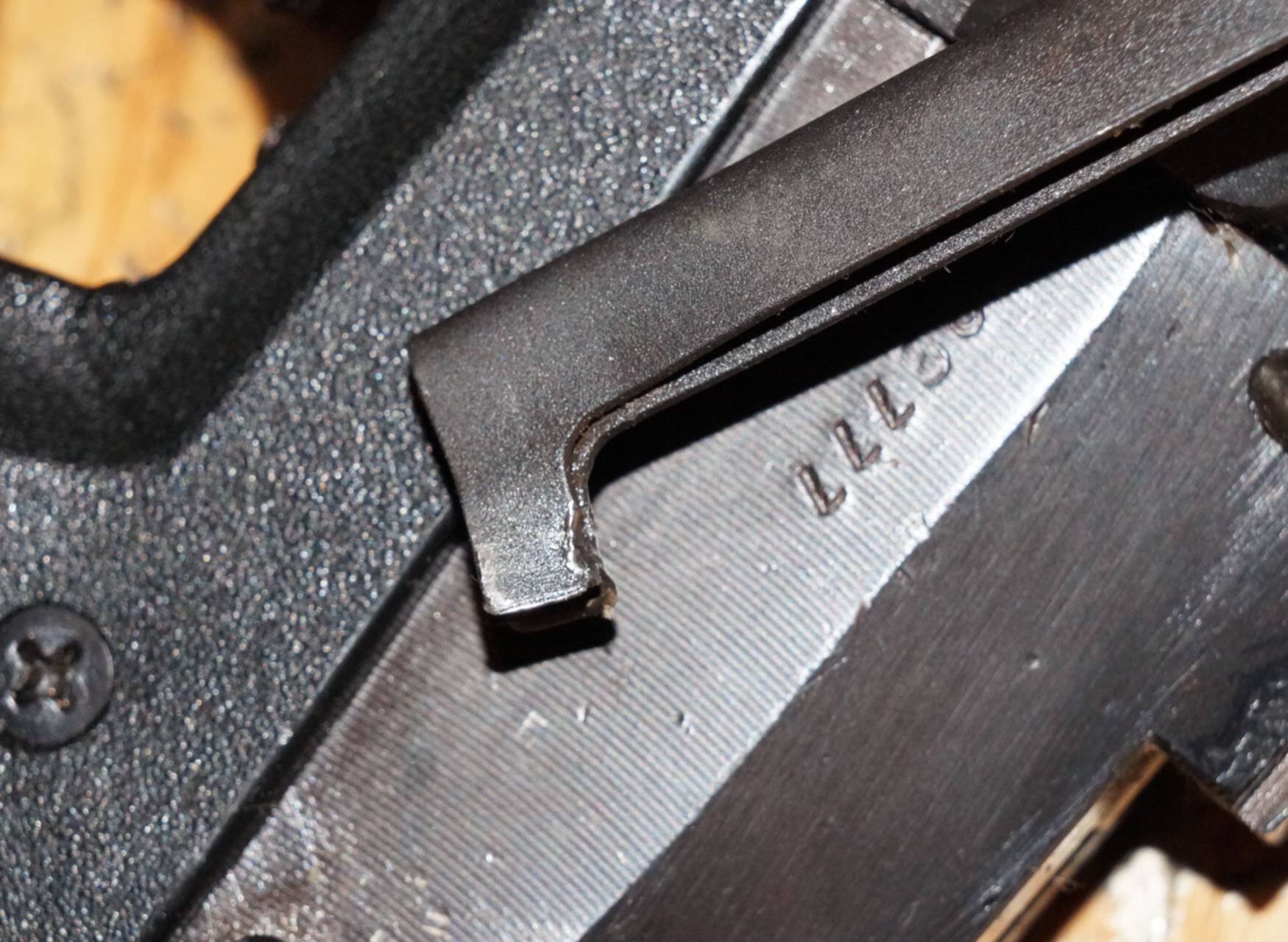 Еще заводского брака хотите? Принесли Stoeger X20, новый, только из магазина. Правда, на сколько я понял, последний. При взведении явно ощущалось излишнее трение, разборка расставила все по своим местам. Китаец на глазок криво приложил тягу взвода к точилу и сформировал завал, который создавал усилие перпендикулярно направленное по отношению к движению поршня. Причем, опять же видно, что приложил сначала до воронения, а потом наверное уже другой хотел поправить, но тоже не смог Поправил, смотрится тоненько, да, но даже этого вполне хватит если не увлекаться супер-премиум-шанс пружинами.