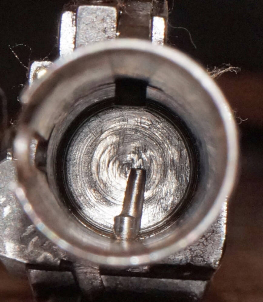 Это я все, конечно, сдвинул обратно и запрессовал новый штифт. Но что же там с заводской странностью? Похоже при изготовлении попросту забыли просверлить перепуск! И уже после сборки сверлили его сверху, там где у современного МР61 находится винтик. Отверстие после этого заварили, зашлифовали и заворонили. И все бы ничего, но сверлили похоже дрелью и с большим неудовольствием! Посмотрите, как красиво сверло выходило со стороны передней пробки компрессора, изнутри!