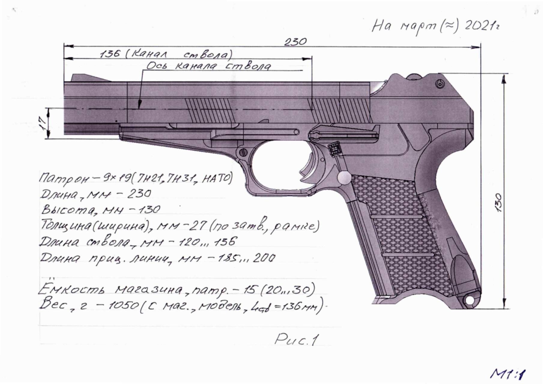 На рисунке показан пистолет на замену АПС с длиной ствола 136 мм.