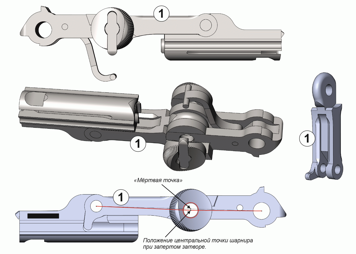 Не медведь, но шатун. Именно с его добавлением получим полноценный механизм запирания. Для тех кто только начинает знакомиться с оружейной темой, уточню, что запирание в данной системе осуществляется кривошипно-шатунным механизмом с опусканием центральной точки шарнира в месте соединения шатуна с мотылём слегка ниже "мёртвой точки", образуя между ними тупой угол, обращённый вершиной вниз. Порой ошибочно пишут, что они находятся строго в "мёртвой точке" - это неверно. "Верхушка" в сборе. |