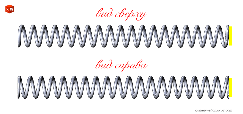 Раз уж появилась пружина, осветим и этот момент, т.к. метод построения оных в ходе прочего претерпел существенное переосмысление. Отмечу, что первый виток не прижимается ко второму. На фотографиях люгеровских пружин у многих первые два витка поджаты, но, смею предположить, что это следствие усадки(сколько лет под гнётом были, однако). Если надо, поджать - не проблема, но текущий вариант исполнен согласно документации. Но суть не в этом, а в том что наконец-то удосужился рассчитать зависимость шагов разных участков от общей длины пружины, что дополнительно позволило создать пружину на основе одной единственной спирали. При этом отсутствуют "ломаные" переходы в участках изменения шага, все перетекания плавные, при изменении размера длины происходит корректное перестроение модели с исключением пересечения витков в переходных участках. Также этот метод, как и прежние, позволяет без проблем сделать пружину адаптивной в сборке.