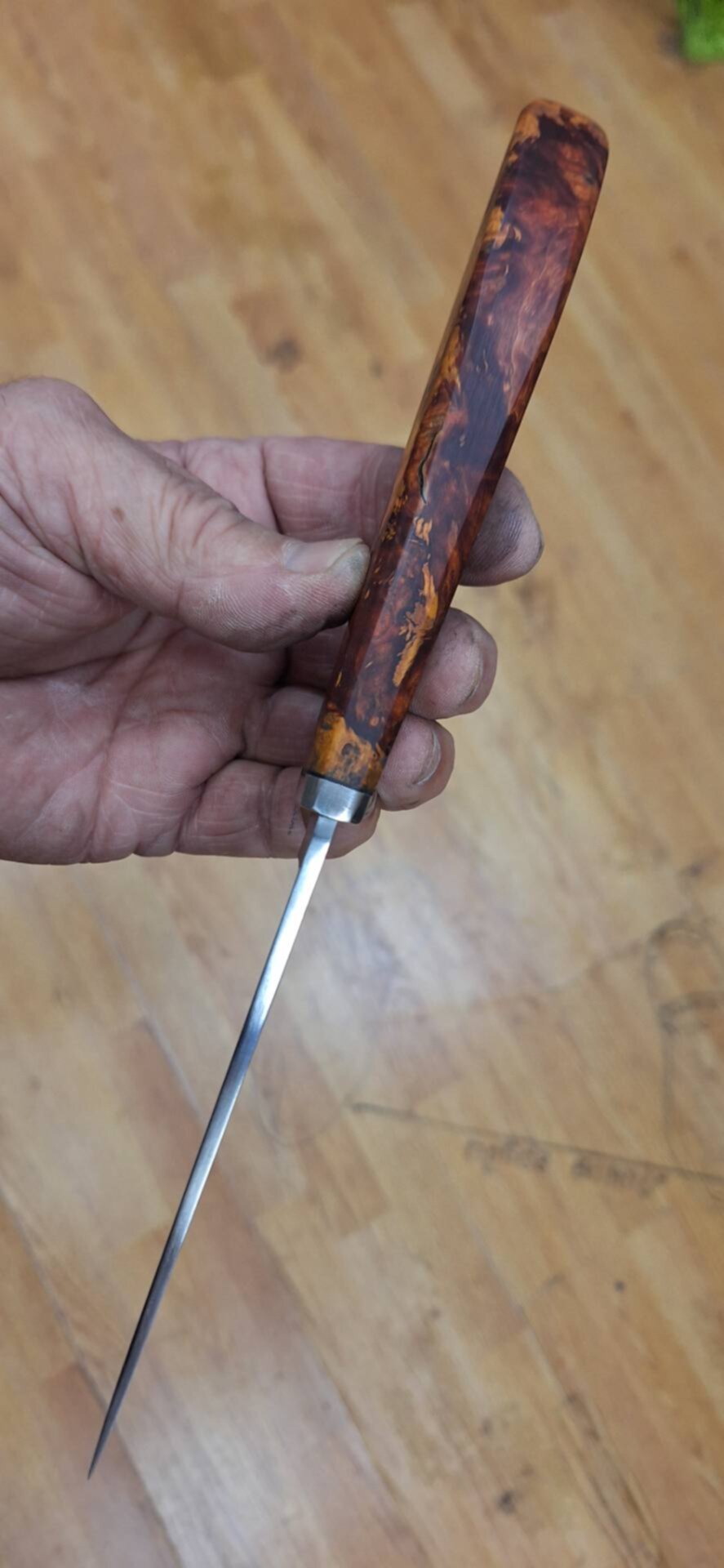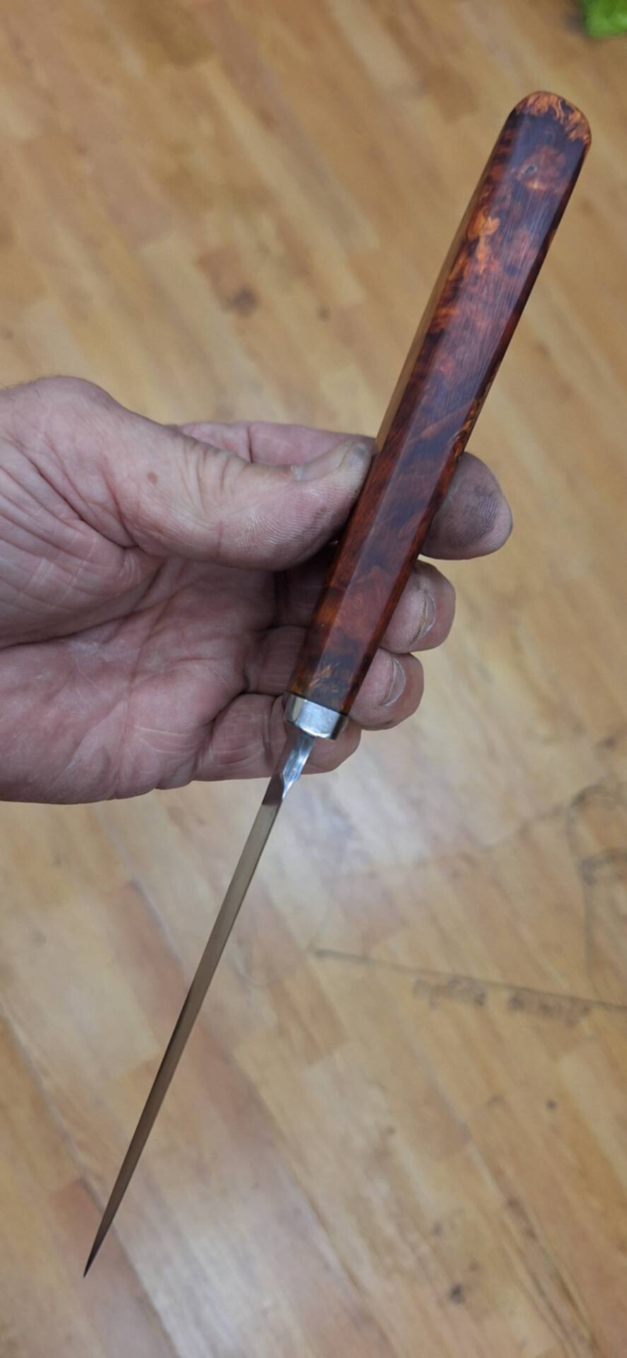 Спасибо, Иваныч, за оценку! А началось всё с одного случая, когда мой друг-охотник зашёл ко мне в гости со своей женой. Та оказалась на кухне, увидела мой личный овощник, повертела его в руках и .. . сразу же обратилась к своему мужу с вопросом: "А хули ты мне такой нож не сделал?" Ну, а, когда жена моего друга потом получила ножик своей мечты, она, естественно похвалилась своей новой любимой игрушкой перед своими подругами. Ну и .. . у двух уже существующих братьев-близнецов, естественно, появились другие братики. Вот такая история .. . |