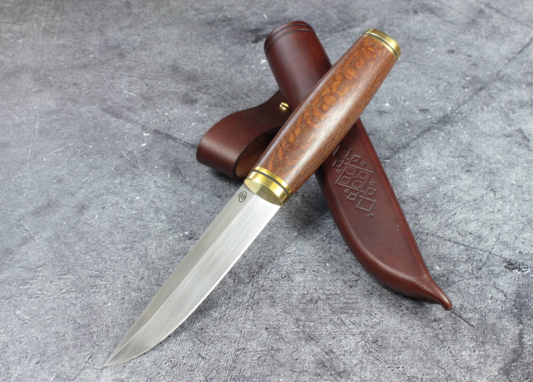 Общая длина 246 мм, клинок длина 130 мм в сечении ромб, толщина обуха 2,5 мм, по ребру 3,5 мм, сталь PGK Твердость 63-63,5 ед. ручной продольный сатин, сведен около 0,2 мм. Рукоять кап березы, пропитана тунговым маслом и восковой мастикой, длина 116 мм, латунь, монтаж сквозной на резьбовую стяжку, ножны кожа растительного дубления, с деревянным вкладышем, пропитаны водоотталкивающим маслом и кремом на основе натуральных восков и масел, подвес свободный. ПРОДАН