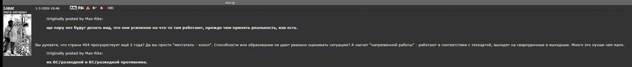 непроверяемый личный опыт это неотразимый аргумент, да. В недобросовестной пропаганде на основе демагогии. Территории кладбищ известны и видны со спутников. Ни кто из западных инфопомоек и прочих пездуз так и не осилил просчитать относительную динамику роста территорий кладбищ в РФ и на Украине. Как же это получилось, почему же этого ни кто сделал?! (голосом Аристарха Людвиговича). Хотя можно посчитать и по другому. По числу случаев дезертирств. Из армии "военов света\военов добра" с линии фринта сбежал каждый второй "показаченый". Причем это официальная статистика киевского режима. Как обстоят дела в российской армии? И я спрогнозирую, что будет дальше. Дальше ботье замолчит, сделает паузу на три дня, пропустив пару страниц и заведет пропагандистскую помойку заново. |