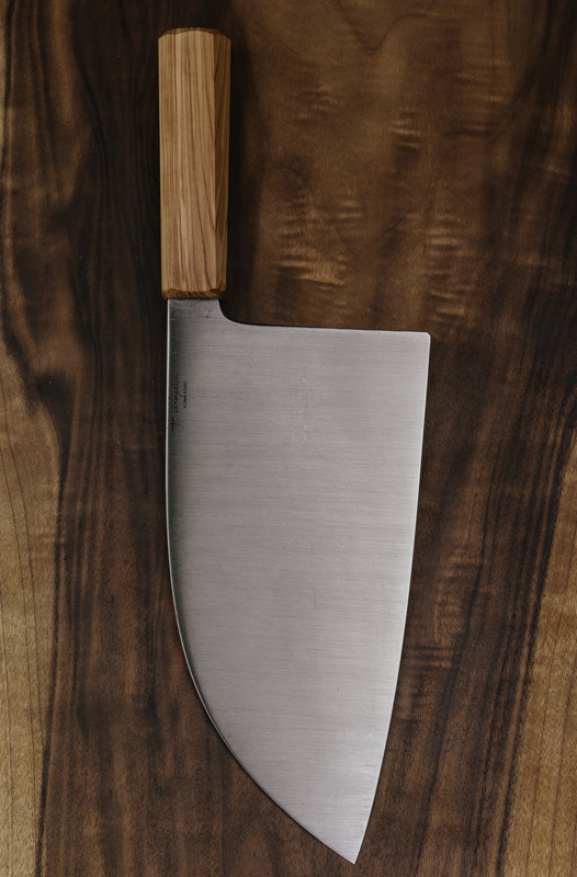 При такой ширине будет небольшой угол спусков даже с обухом 5 мм. Если там ширина 90 мм или больше, то угол спусков будет сопоставим с углом спусков на шефе шириной 45+ мм и обухом 2,5 мм. Плюс нож режет (проникает в материал) за счёт собственной массы, а роль оператора по большому счёту сводится к управлению инструментом. |