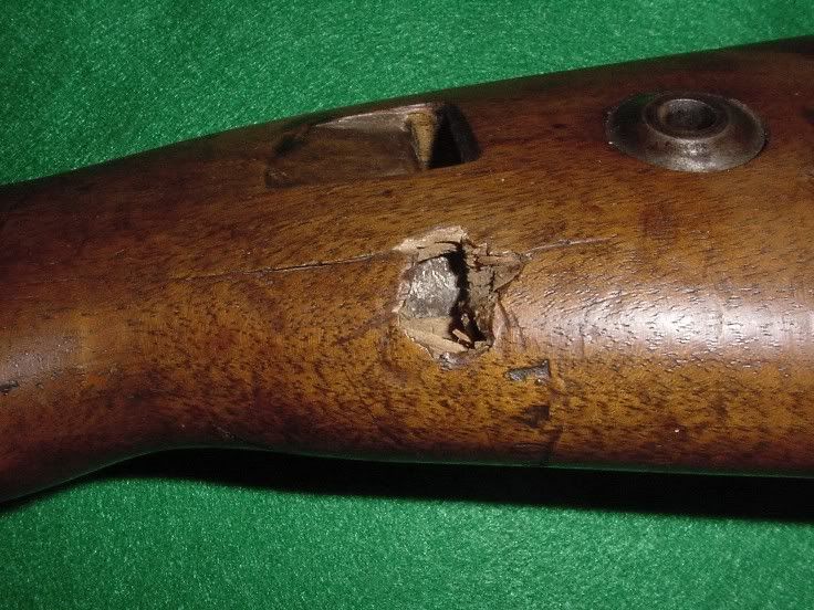 В результате в 1906 г. был принят "удлиненный карабин", который известен как Kar 98AZ, Kar 98a или Kar 98(a). Вот ниже мой Kar 98AZ: Карабин воевал и был "ранен" - см. осколок в прикладе: |