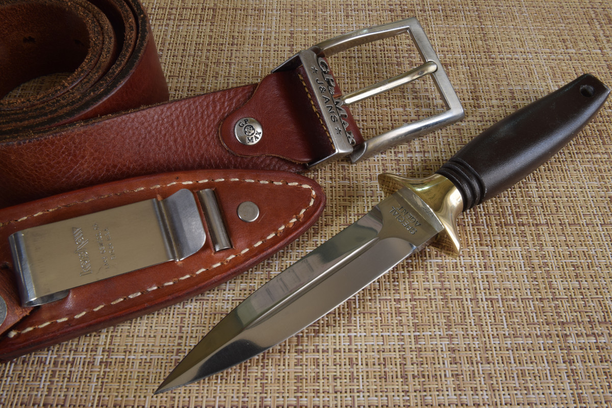 Заинтриговали. Нашёл этот пост: Кинжалы и кинжалоиды (версия 2.0) Пентагон первый - кинжал культовый, и заслуженно. У меня лишь малыш Гербер/Фантони Ривер Мастер, с плейновой заточкой из N690. Дизайн "Блэки" Колинза, но очень уж формы Пентагона повторяет, может создатель у них один? Жаль, не успел приобрести вариант с волновым серрейтором из AISI 425 |