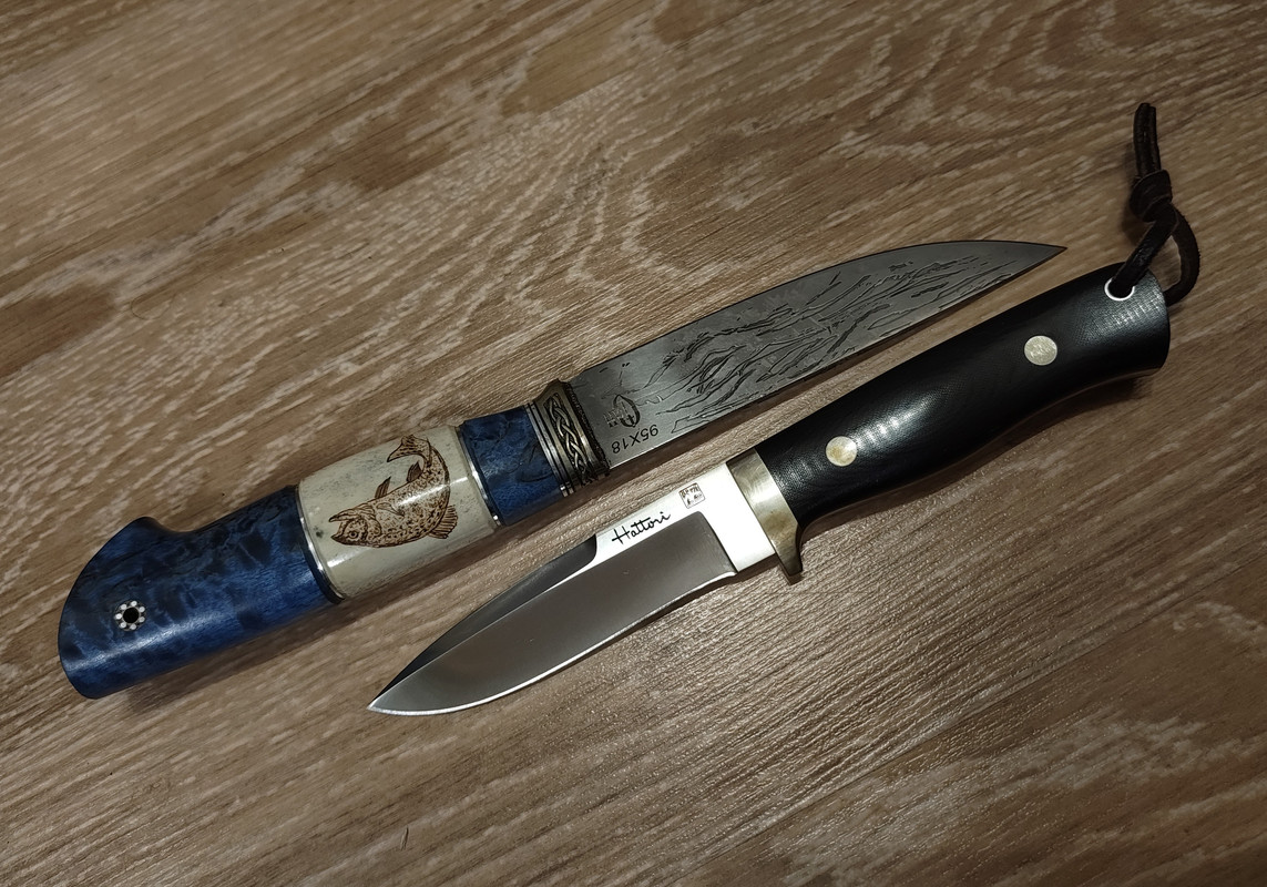 Пожалуй единственное обьединяющее сходство рыбацко-туристических ножей это клин из нержи по понятным причинам. Также хотелось бы яркие рукояти,уменьшающие шанс утери. Мечтается о положительной плавучести,но врятли это возможно ибо тонюсенькое лезвие с пустотелой рукояткой не соответствуют концепции универсального ножа.