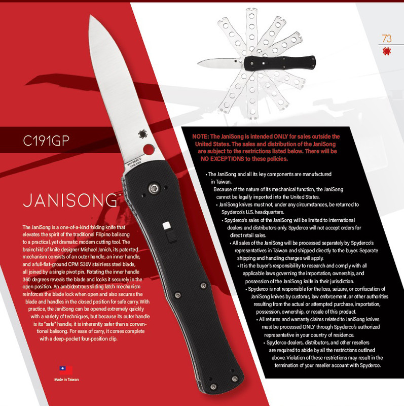 Тогда же было записано видео, на котором рассказывается об отличиях ДжаниСонга от традиционных балисонгов, и показано несколько вариантов открытия/закрытия этого ножа. Полноценного серийного производства не получилось, так как пути Майкла Джанича с компанией BLACKHAWK! разошлись. Уходя из Блэкхок, Джанич выкупил патент на JaniSong, а в 2009г., прийдя работать в Spyderco, продал патент и все права на нож им. Но и здесь серийного производства пришлось ждать довольно долго. Впервые прототип Spyderco С191 JaniSong был показан на SHOT Show в начале 2014 года. Тогда на форумах стали обсуждать будущую модель и интересоваться, будет ли этот нож легален в США, и Сэл Глессер уверял, что JaniSong не является балисонгом и наверняка с куплей-продажей в США проблем не будет. Но вот в 2015г. JaniSong наконец был запущен в серию с производством на Тайване, и всё-таки попал в категорию "Restricted Models", т.е. в модели, оборот которых ограничен. "Технически это не классифицируется как балисонг, но мы предполагаем, что наши "лидеры" в своей "мудрости" будут думать о нём как о ноже-бабочке или гравитационном ноже, и мы предпочли бы избежать неприятностей... " Проблема заключается в Законе Federal Switchblade Act 1958 года, или, как его называют, "Закон об автоматических ножах" (Switch-Blade law). Этот закон не запрещает владение определенными ножами, но запрещает торговлю автоматическими, гравитационными ножами и балисонгами между штатами, пересылку их по почте, а также коммерческий ввоз таких ножей или деталей для их изготовления в страну. Поэтому с ДжаниСонгом сложилась странная ситуация, которая раздражает многих американских любителей ножей: нож производства американской компании американцам легально приобрести почти нет возможности. Наверное, в первую очередь огорчён таким положением вещей сам создатель конструкции - Майкл Джанич. "Разочаровывает, что одна из самых крутых вещей, которые я когда-либо выжимал из своего мозга, не так широко доступна, но в то же время я чрезвычайно благодарен Spyderco за ее создание и воплощение в жизнь" Нечто подобное уже было раньше с балисонгами Spyderco Spyderfly и Szabofly, и результатом таких проблем стало довольно быстрое снятие этих моделей с производства. В случае же с JaniSong, мистер Глессер писал, что есть надежда на отмену Federal Switchblade Act, какие-то шаги к этому предпринимаются, и тогда JaniSong может производиться в Голдене в США, иметь разные формы клинка, разные материалы накладок.. . Это он писал уже довольно давно, последнее время про это разговоров уже не ведётся. Даже в Spydiewiki, в статье про ДжаниСонг, есть фраза: "Учитывая тот факт, что JaniSong имеет статус ограниченной модели и продаётся только за территорией США, С191 в отличном состоянии с оригинальной упаковкой будет иметь большую коллекционную ценность". Всё чаще возникают вопросы, не будет ли JaniSong в ближайшее время снят с производства, но пока его история продолжается. О конструкции Модель Spyderco JaniSong имеет некоторые отличия в конструкции от модели BLACKHAWK! JaniSong. Из видимых различий это облегчённые лайнеры, в которых просверлены круглые отверстия, иной гринд клинка, немного изменённые обводы рукояти и 4-х позиционная клипса. Из невидимых - в клинке прорезан паз, позволяющий клинку двигаться только в определенных пределах, которого не было в запатентованной конструкции.