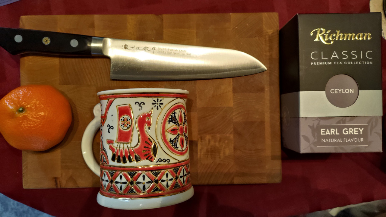 ЗЫ: для минимизации эффекта влияния грубого сахара на утончённый вкус зелёного чая подобрал конфеты с дальневосточным названием 😂. Да и чай заварил вьетнамский - у него ароматика не такая деликатная. Наоборот: вкус мощный, насыщенный, конфеты на его фоне звучат особенно гармонично. И нож тоже из тех далёких Азиатско-тихоокеанских краёв. С уважением. |